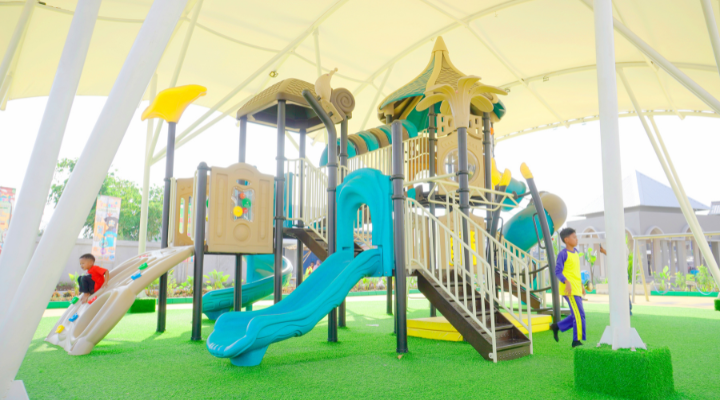 Playground ini berfokus pada permainan ayunan dengan berbagai model: single swing, duo swing, hingga bird nest swing. Ayunan memberi stimulasi sensorik vestibular yang sangat baik untuk anak.
